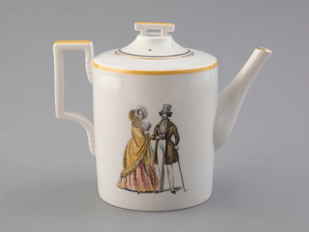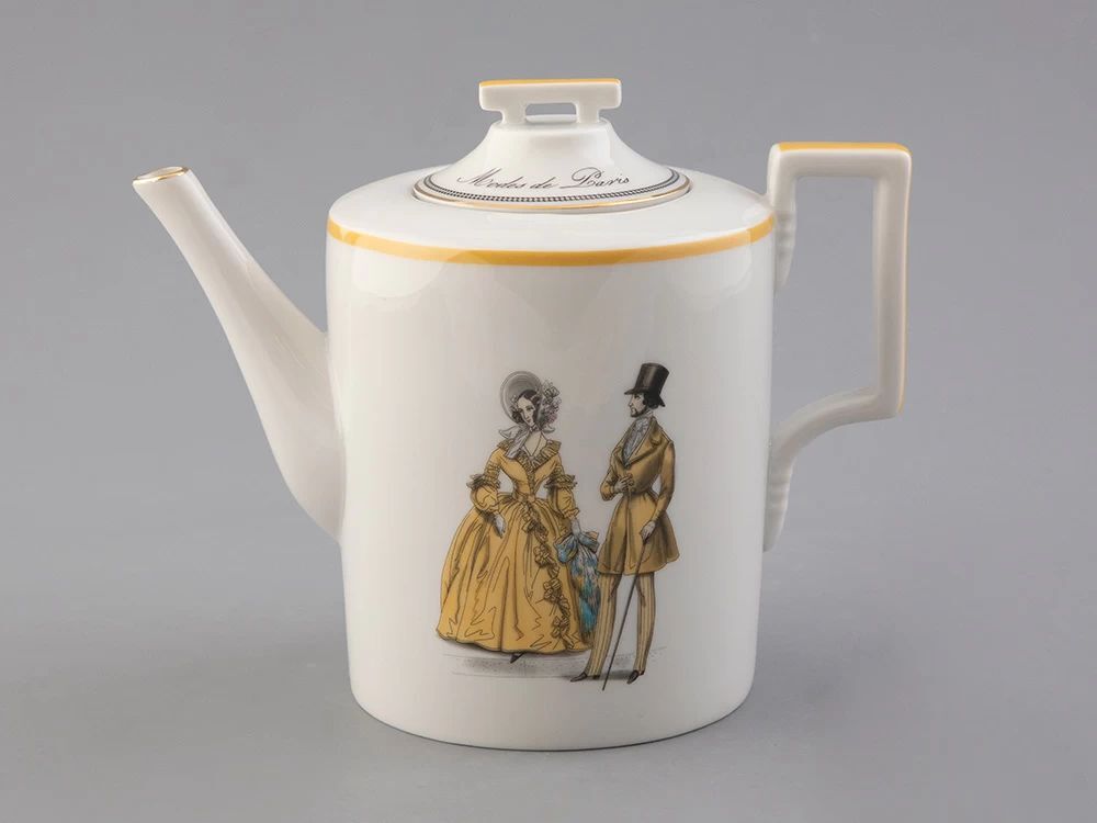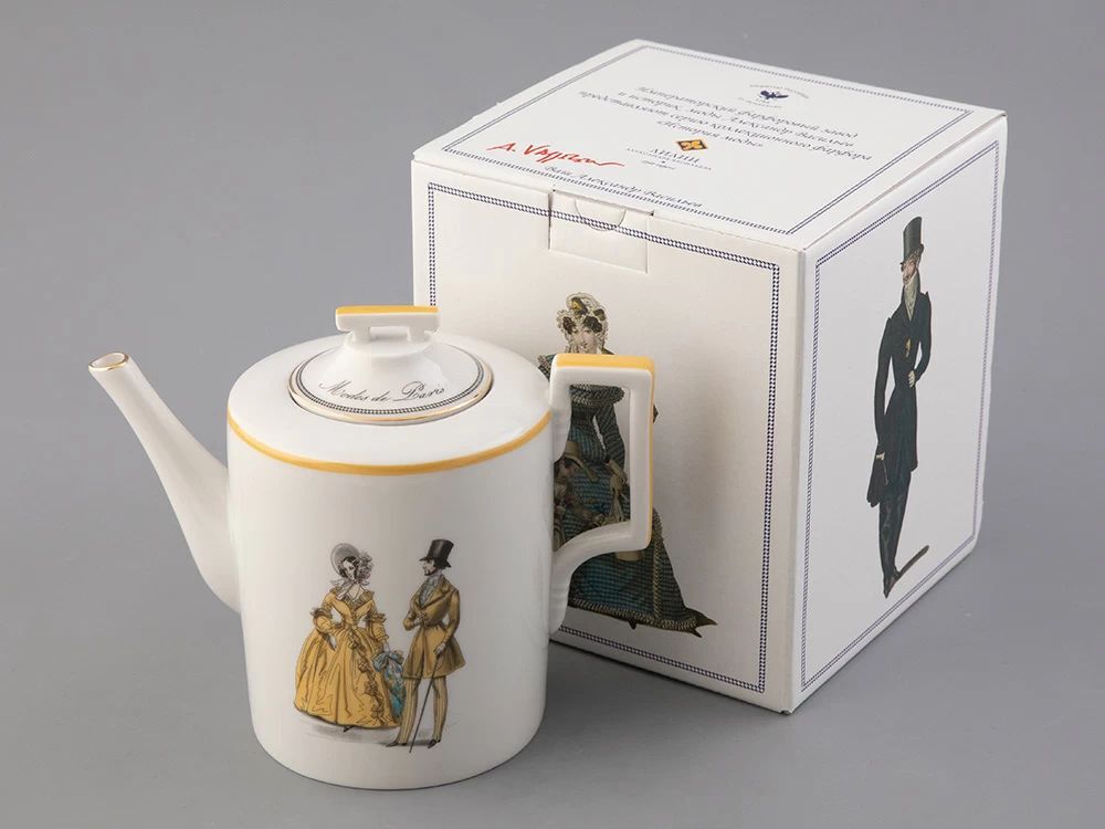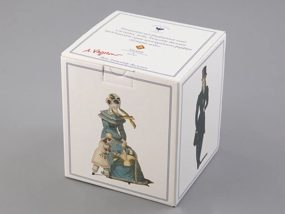 Александр Васильев и Императорский фарфоровый завод разработали уникальную коллекцию фарфора «История моды». Сочетание белоснежного фарфора с цветными рисунками, исполненными по мотивам старинных модных иллюстраций XIX столетия из личной коллекции маэстро, придает изделию парадный вид и современное звучание. Сегодня гравюры с изображением и кратким описанием нарядов той поры, вручную раскрашенные акварелью, являются настоящим раритетом и бесценным историческим свидетельством ушедшей эпохи. Сахарница отмечена фирменным знаком качества и стиля – «Лилии Александра Васильева». В серии «История моды» также выпущены чайные пары «Прелестница», «Денди», чайник и десертные тарелки. Разнообразие модных образов на фарфоровых предметах позволит собрать полную коллекцию, которую можно использовать как в качестве парадного сервиза, так и в виде миниатюрного «tea-а-tеt». Элементы золота в декоре, гармония росписи с формой превращают каждое изделие в самостоятельное, завершенное произведение искусства. С новой эксклюзивной коллекцией фарфоровых шедевров вы превратите чаепитие в изысканный и увлекательный ритуал и совершите удивительное путешествие в мир истории моды. Подарочный набор заварочный «Modes de Paris 1836» на форме «Гербовая» из коллекции «Прелестница», созданной в рамках совместного проекта с известным историком моды - Александром Васильевым. Форма «Гербовая» восстановлена по музейному образцу.